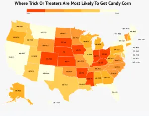 And if you have a hatred for candy corn like I do, and you’re going trick-or-treating tomorrow, I have bad news. Your odds of getting candy corn in your pillow case are high. New research shows that Mississippi is the number one state where trick-or-treaters are likely to get candy corn at just over 45%. Kansas came in 5th at 41.6%. The state least likely to hand out the devil’s candy—Hawaii, where there is only a 11.3% chance of getting candy corn. Now that’s what I call paradise.