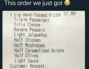 and when the wife is pregnant and she is having a craving, any smart husband doesn’t question it. One man is going viral after posting the receipt from the pizza order his wife wanted. Online, he ordered a large hand-tossed, triple pepperoni, extra cheese, banana peppers, light jalapenos, half chicken, half mushrooms, half caramelized onions, half olives, and light sauce. There was also a note that said, “Yes, I know this looks insane, and you’re probably like, who is this dude? [I have] a very pregnant wife. I’m done questioning what she wants. I’m scared of her, and honestly you should be too . . . Thank you and godspeed.” The internet said this wasn’t a pizza order, it was a cry for help.